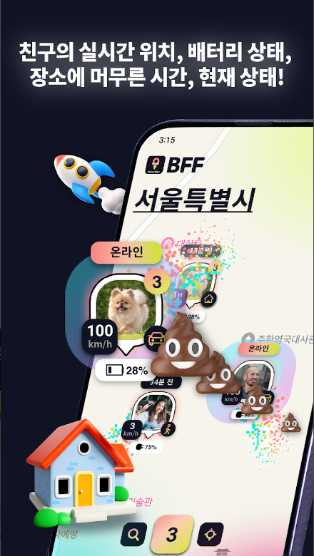 친구와 자동차 여행을 떠나시나요? 하우스 파티에 참석하시나요? 연인을 위해 깜짝 놀랄 생일 이벤트나 데이트를 준비하시나요? 친구의 실시간 위치, 배터리 상태, 장소에 머무른 시간, 현재 상태(학교, 직장, 집, 운전, 운동, 영화관, 샤워, 화장실 등)를 확인해 보세요.